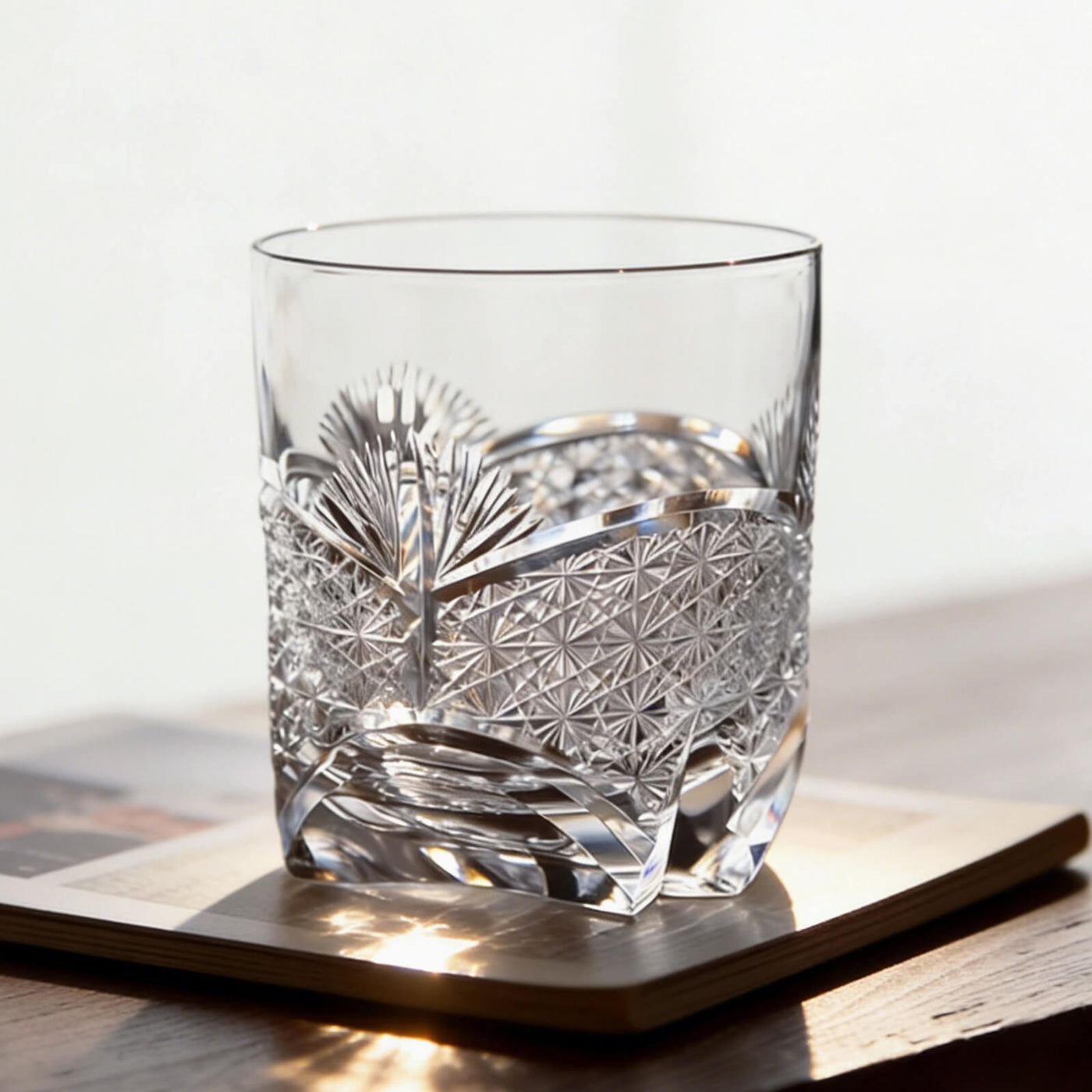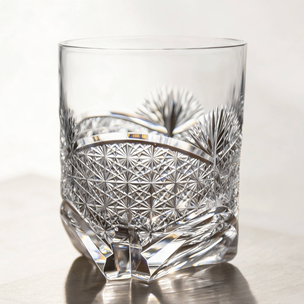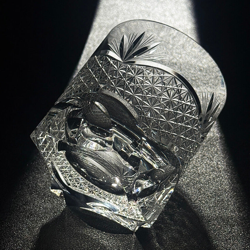 Each glass is hand-cut by skilled artisans using traditional Edo Kiriko techniques. The bamboo leaf motif represents resilience and growth, while the chrysanthemum pattern symbolizes balance and refinement—both expressed through precise angles and carefully controlled cutting depth. Made from high-quality K9 lead-free crystal, the glass is polished to achieve a smooth surface and brilliant light refraction.