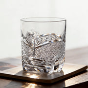 This Edo Kiriko whisky glass features a clear crystal body carved with the traditional Takeha (bamboo leaf) and Chrysanthemum pattern, creating a layered geometric structure that reflects light with exceptional clarity. The fully transparent design allows every cut line to stand out, highlighting the precision and depth of the craftsmanship.